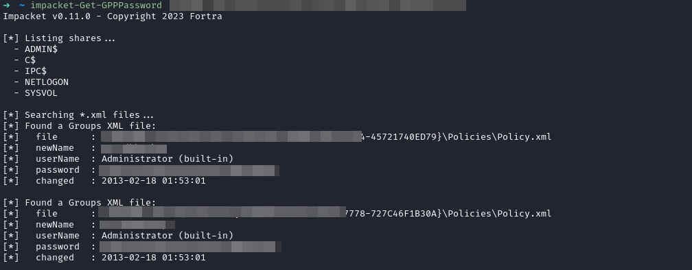 The quickest way to hunting credentials from GPP is using impacket-Get-GPPPassword.