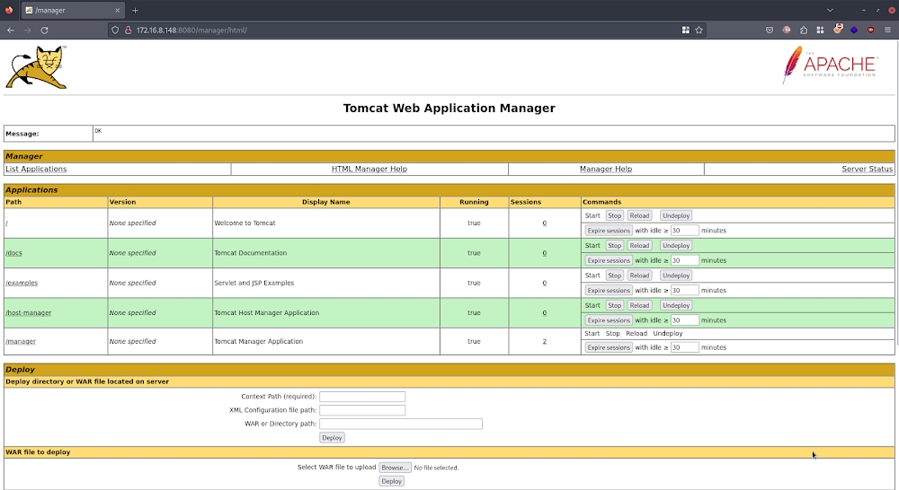 Hydra (https://github.com/vanhauser-thc/thc-hydra) finished at 2024-05-06 21:36:02And then, login into Tomcat Manager.